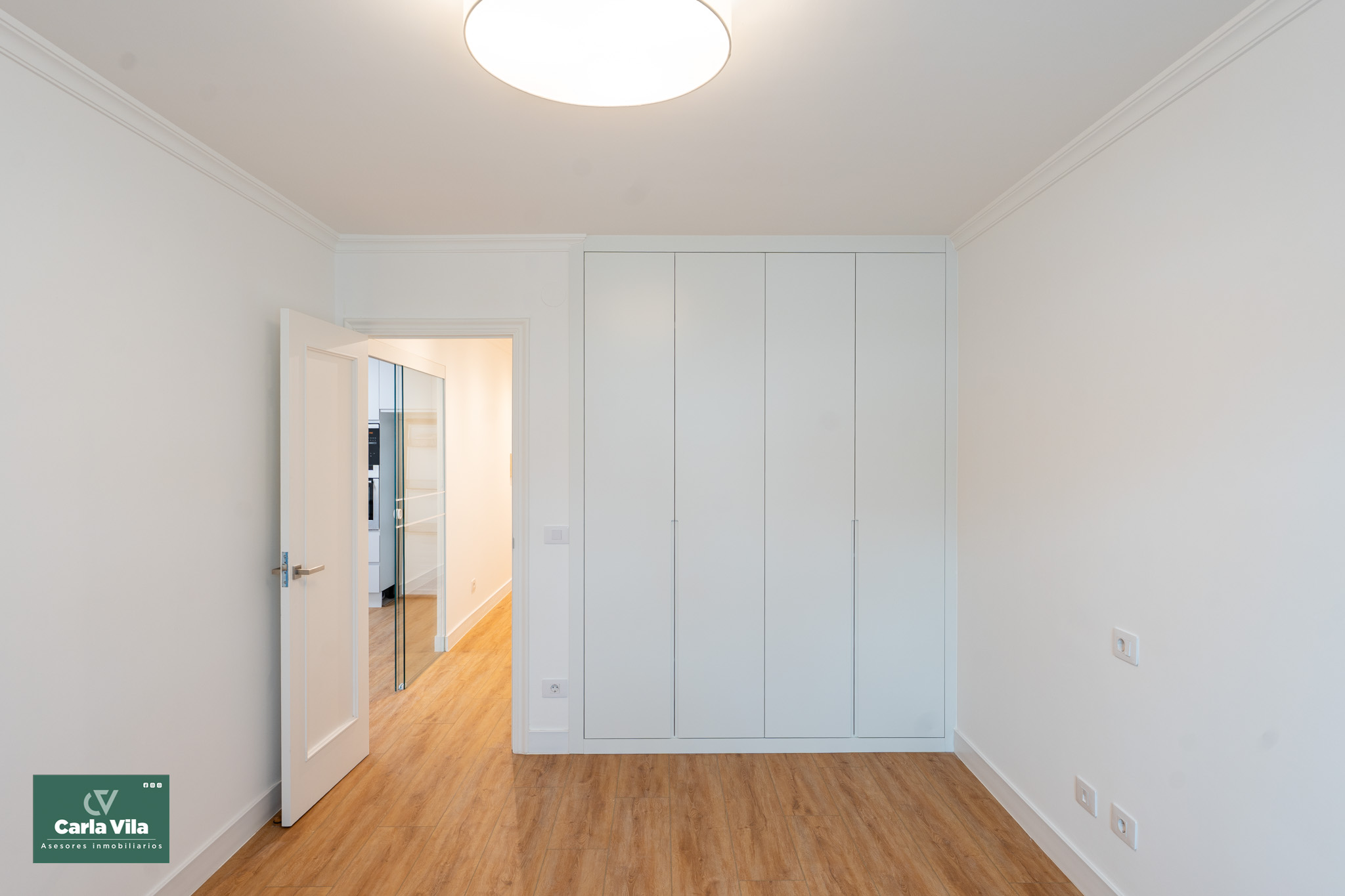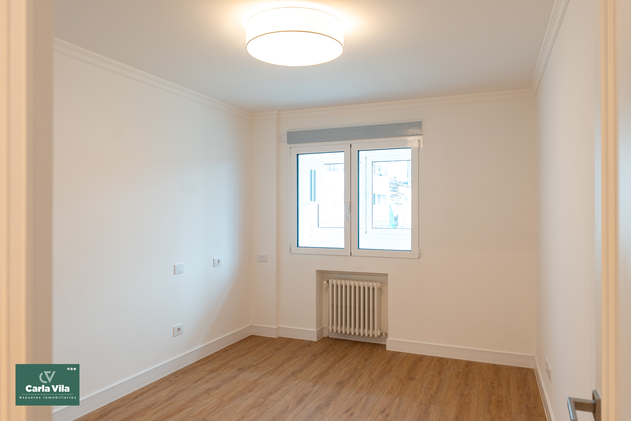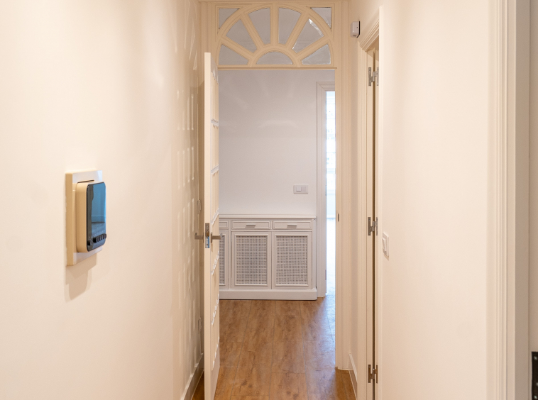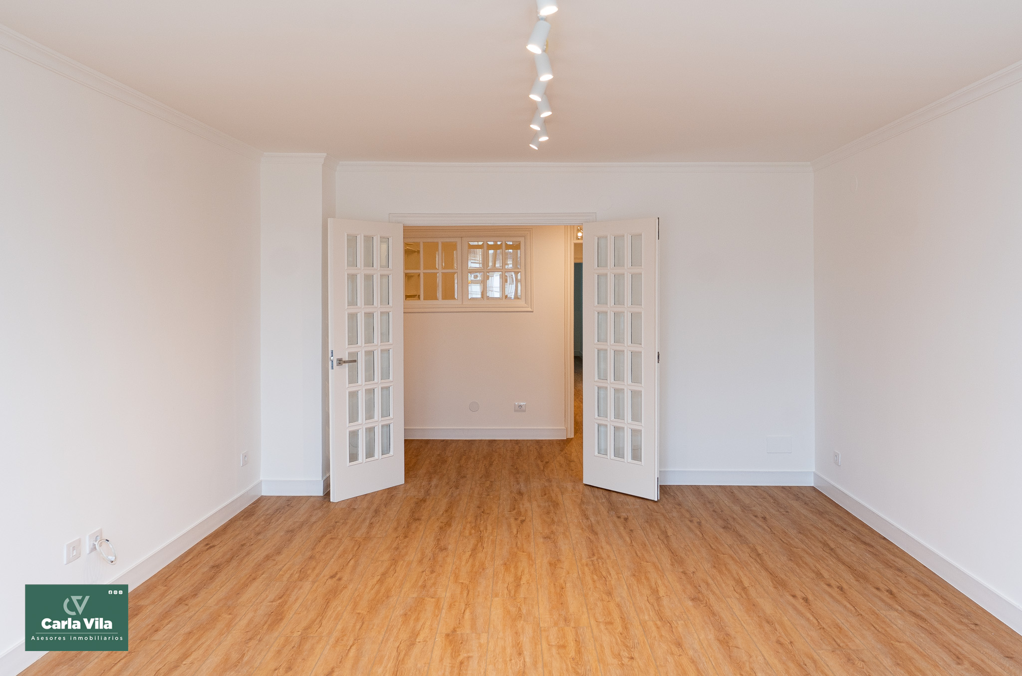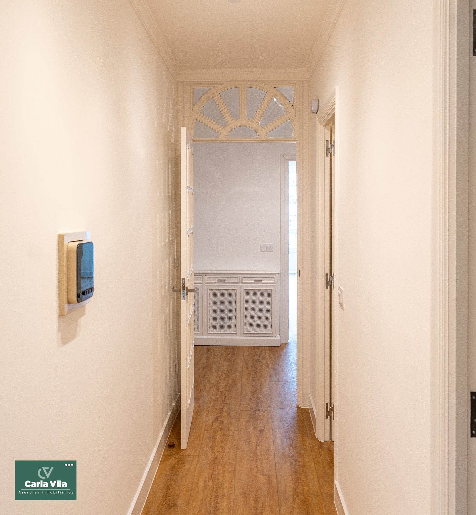 El hall nos conduce al salón de 35 metros y a la habitación principal, equipada con dos armarios empotrados y baño con ducha. La segunda habitación, también con armario empotrado, recibe luz sur, mientras que la tercera, más compacta, funciona perfectamente como despacho o espacio auxiliar. Un baño amplio con bañera da servicio al resto de la vivienda.