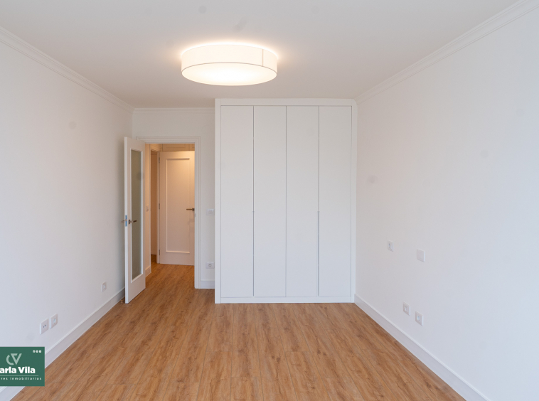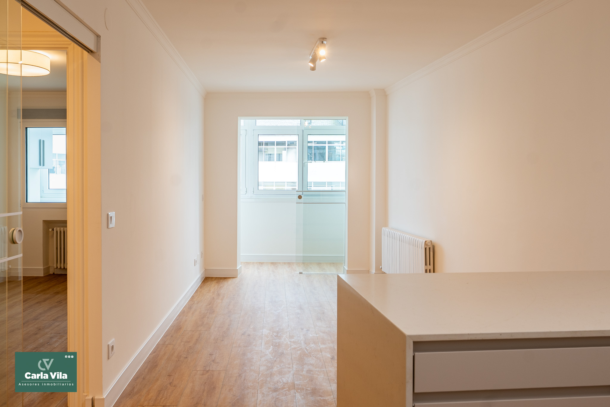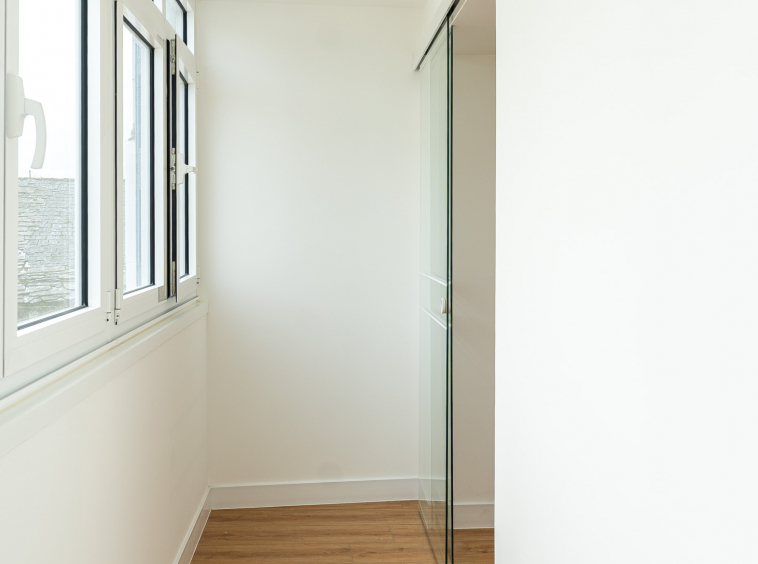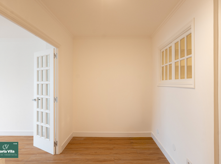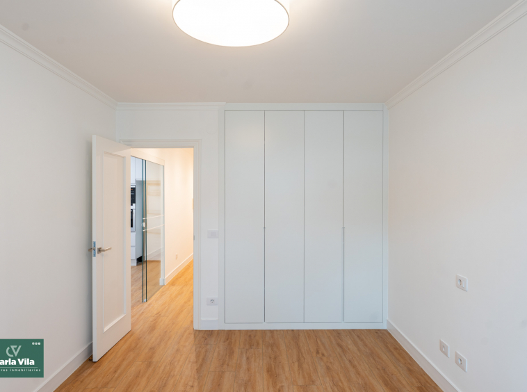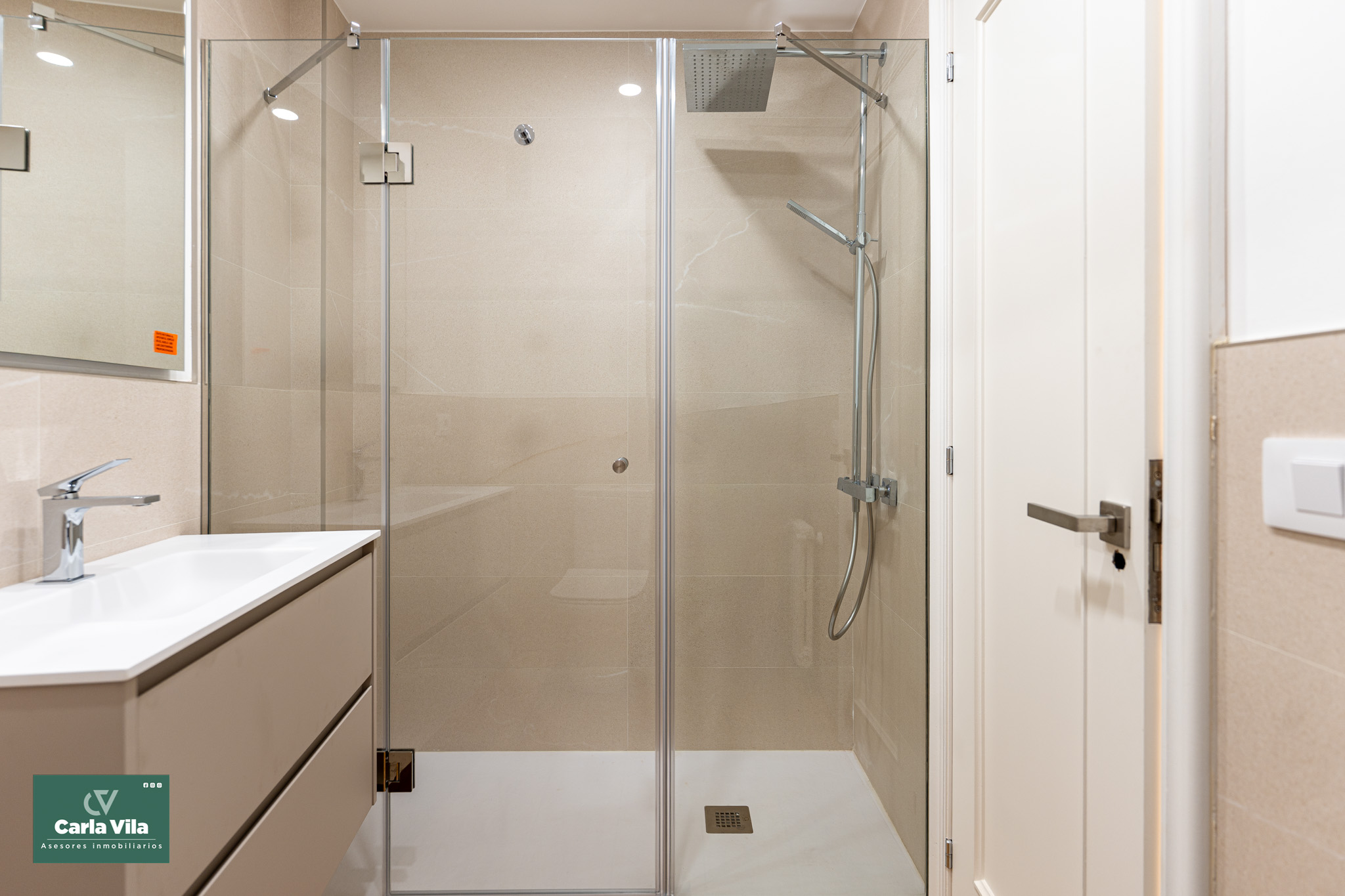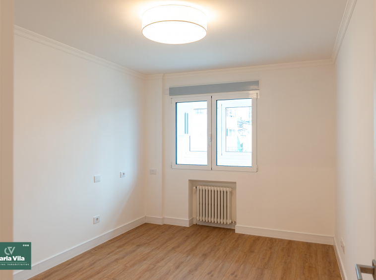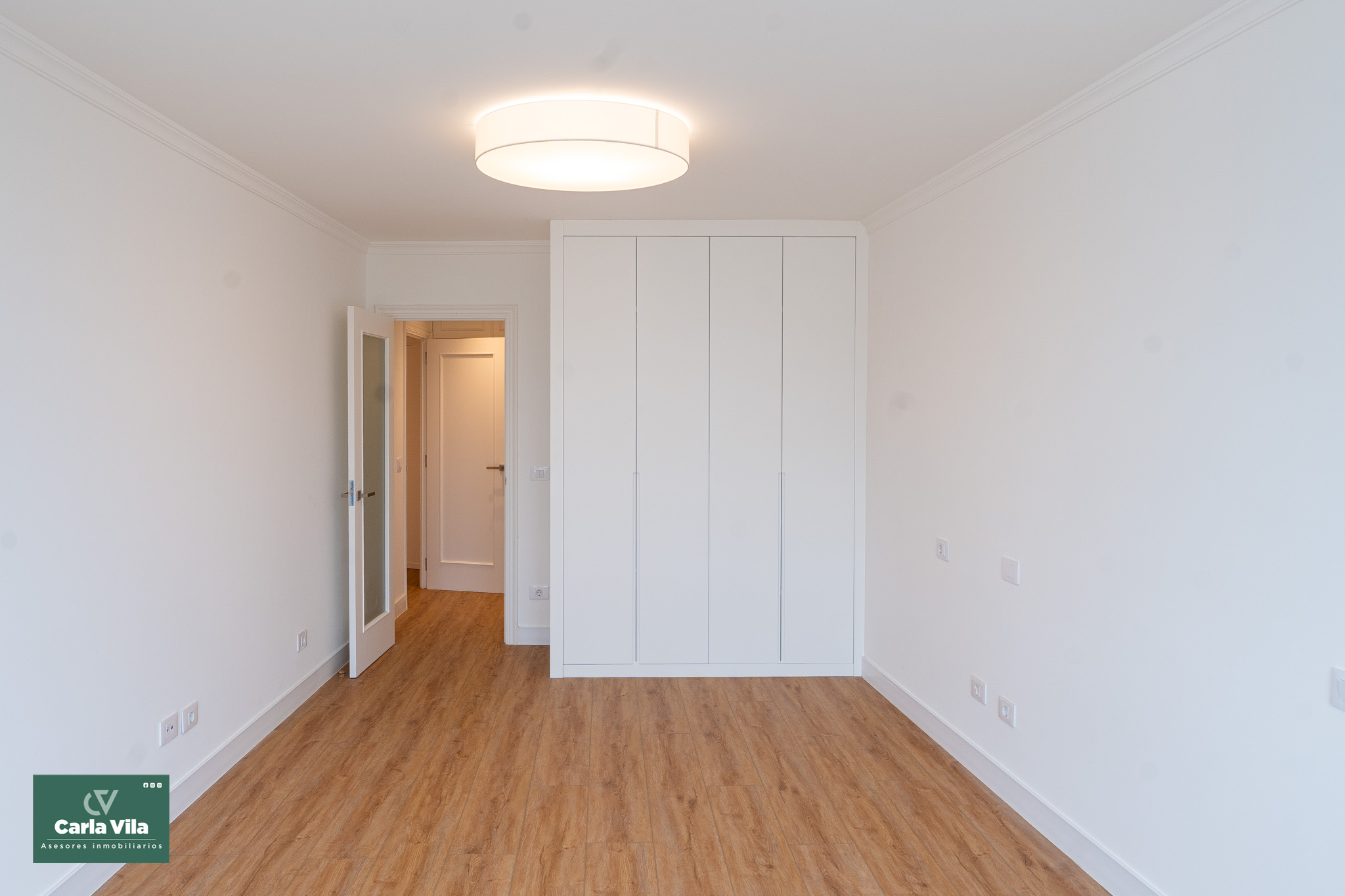 El hall nos conduce al salón de 35 metros y a la habitación principal, equipada con dos armarios empotrados y baño con ducha. La segunda habitación, también con armario empotrado, recibe luz sur, mientras que la tercera, más compacta, funciona perfectamente como despacho o espacio auxiliar. Un baño amplio con bañera da servicio al resto de la vivienda.