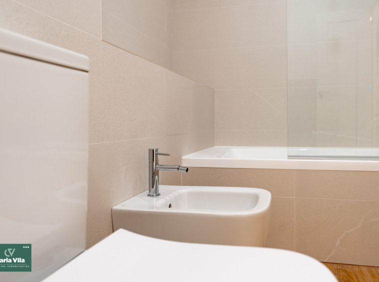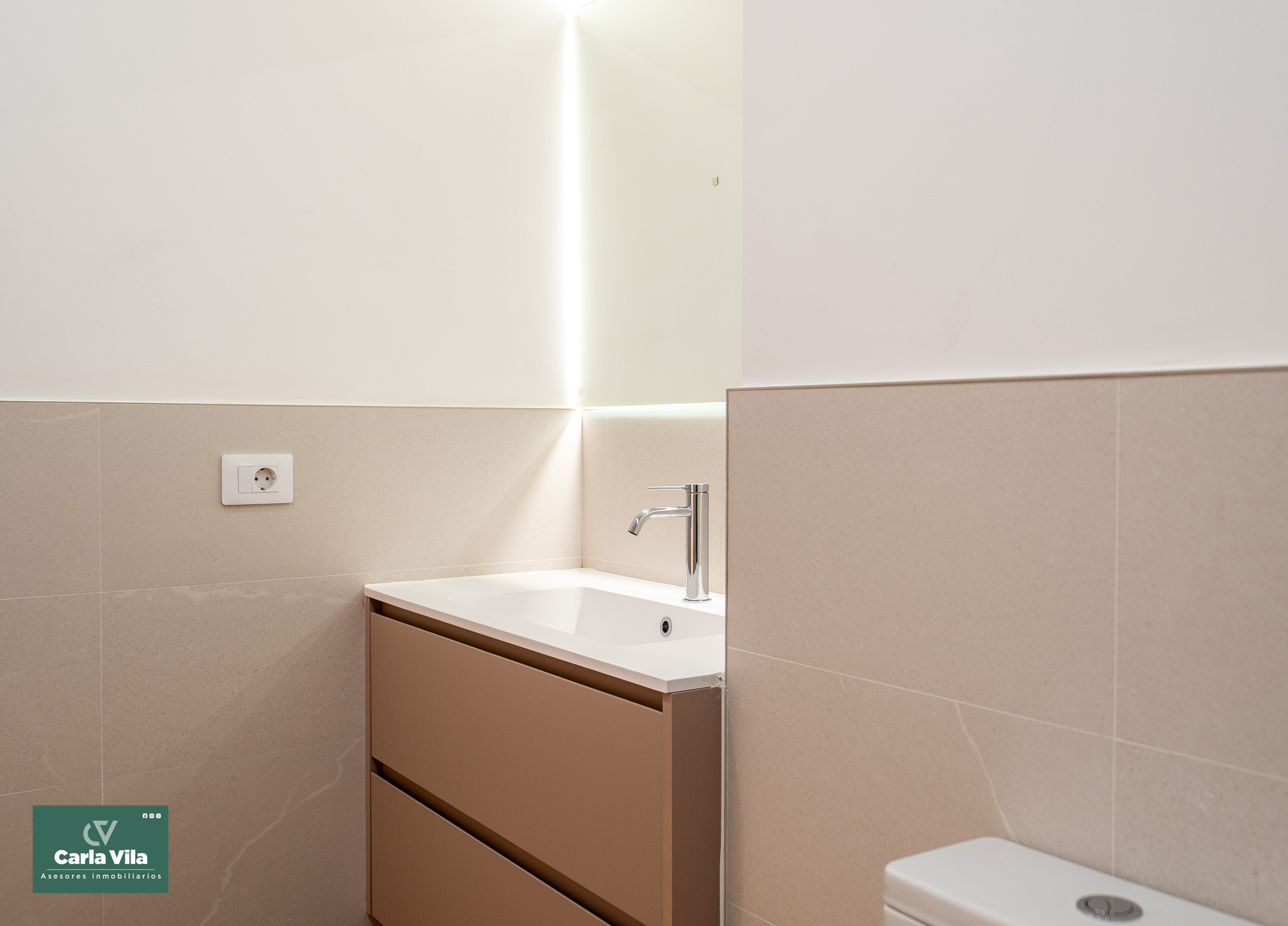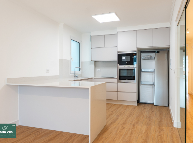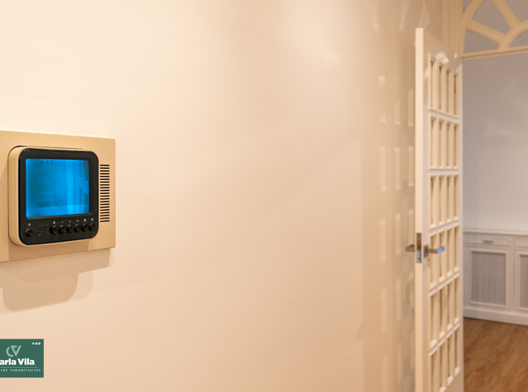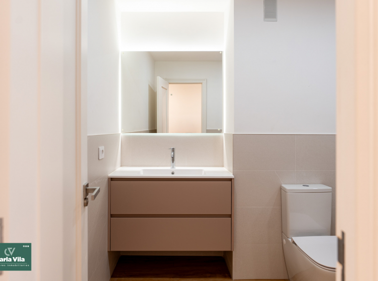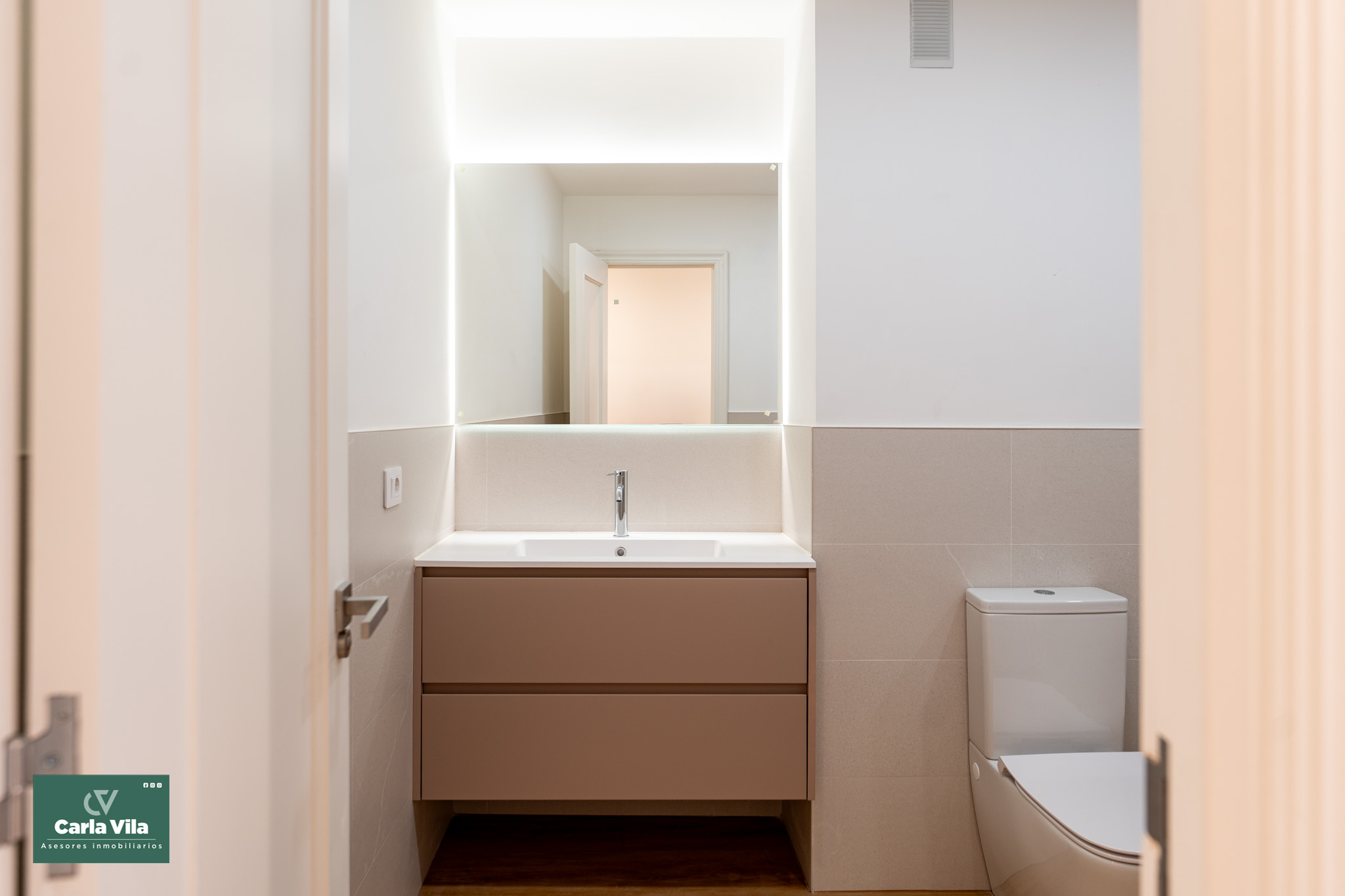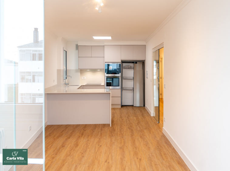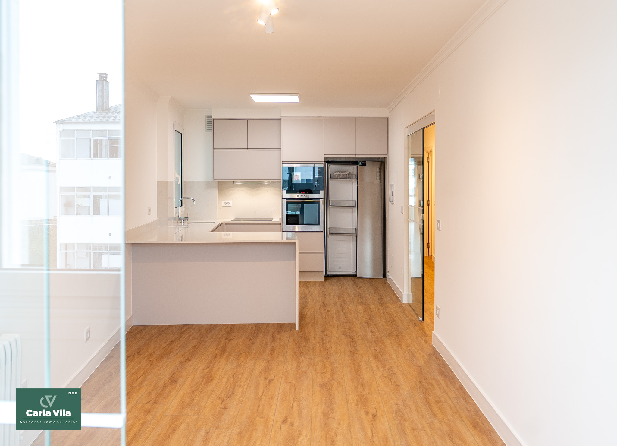 El hall nos conduce al salón de 35 metros y a la habitación principal, equipada con dos armarios empotrados y baño con ducha. La segunda habitación, también con armario empotrado, recibe luz sur, mientras que la tercera, más compacta, funciona perfectamente como despacho o espacio auxiliar. Un baño amplio con bañera da servicio al resto de la vivienda.