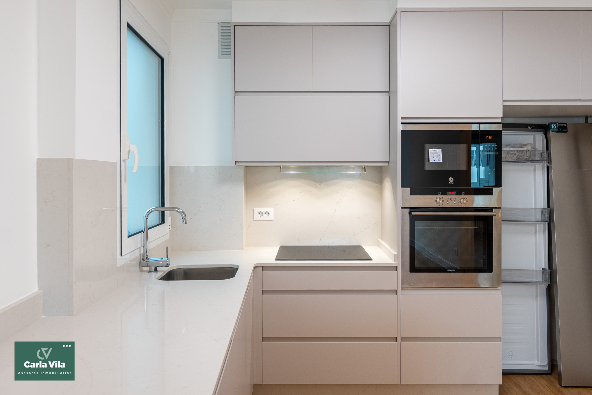 La cocina con office amplio se abre a una galería-tendedero orientada al sur, un rincón donde el sol entra generoso y se alcanza a ver parte de la Muralla, haciendo del desayuno o la pausa del café un pequeño momento de placer cotidiano. Además, contar con una plaza de garaje amplia en pleno centro es un lujo poco frecuente que suma comodidad real a este hogar, junto al ascensor y el portal sin barreras arquitectónicas.