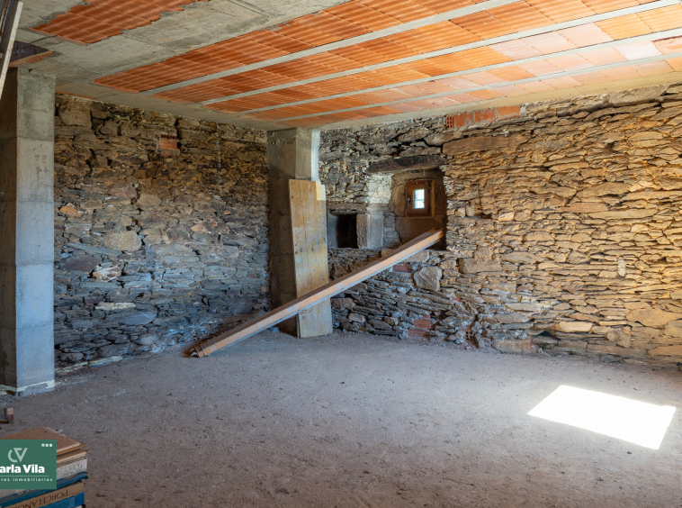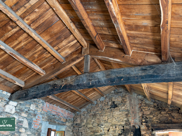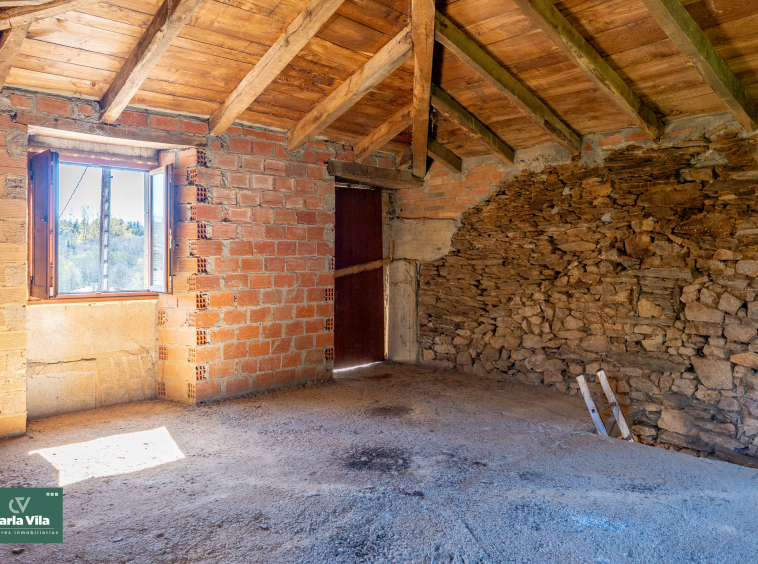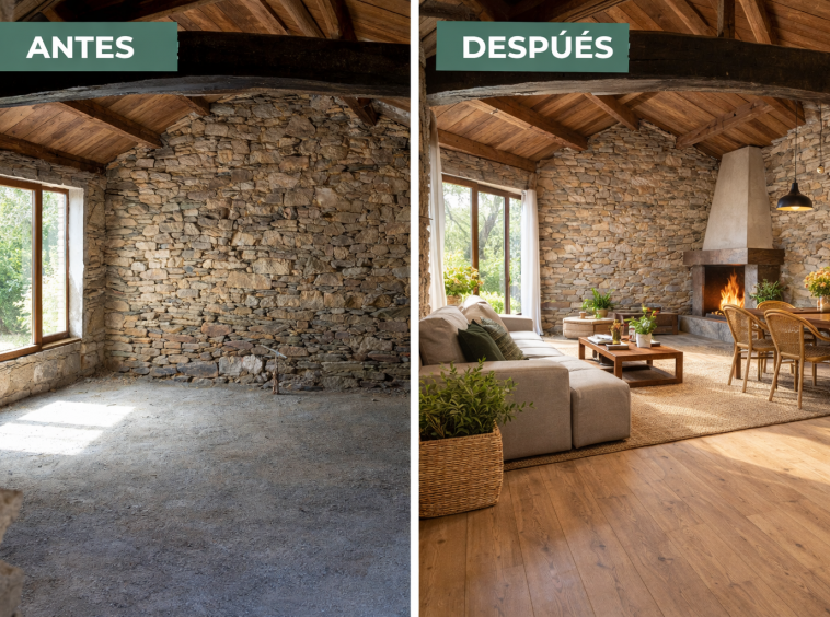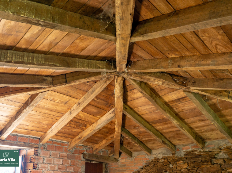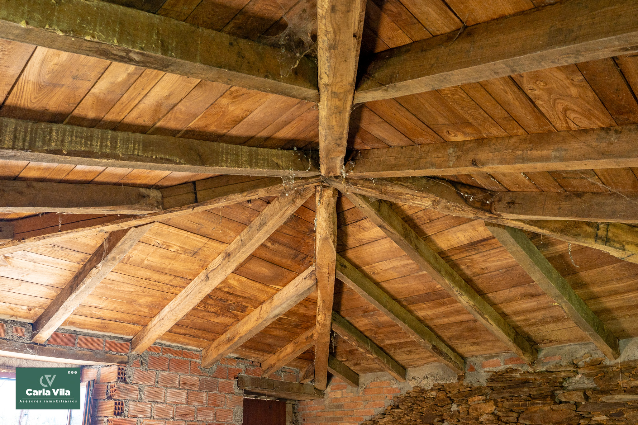 En el interior, los 160 metros ofrecen un lienzo abierto donde proyectar algo muy especial. La vivienda se organiza en dos cuerpos separados por una sólida medianera de piedra, una división natural que permite imaginar con claridad los espacios. En una de las partes, una zona diáfana de unos 40 metros donde cocina y salón pueden convivir bajo un techo alto de madera con vigas vistas, acompañados por una chimenea que no solo caldea, sino que devuelve ese calor de hogar que solo la leña sabe dar. Visualizar aquí una chimenea francesa, abierta y protagonista, es casi inevitable.