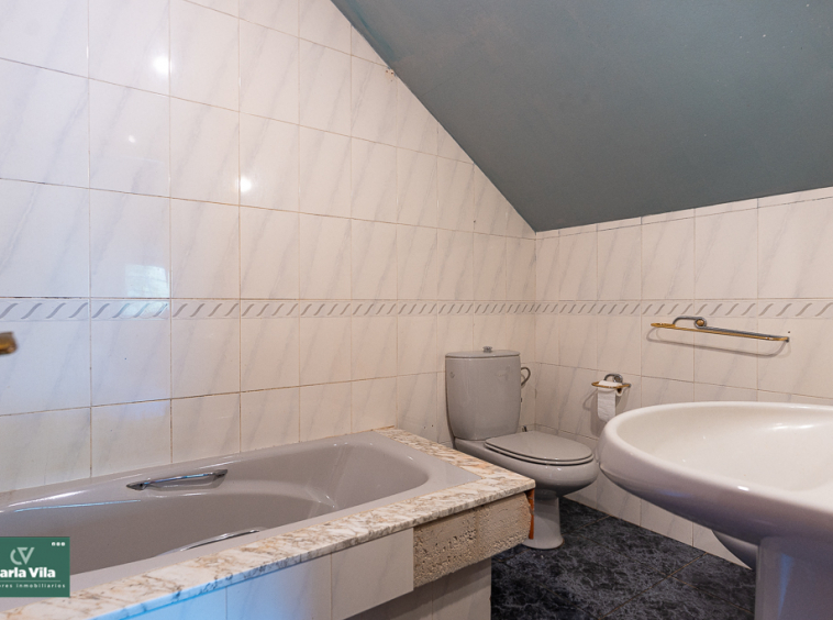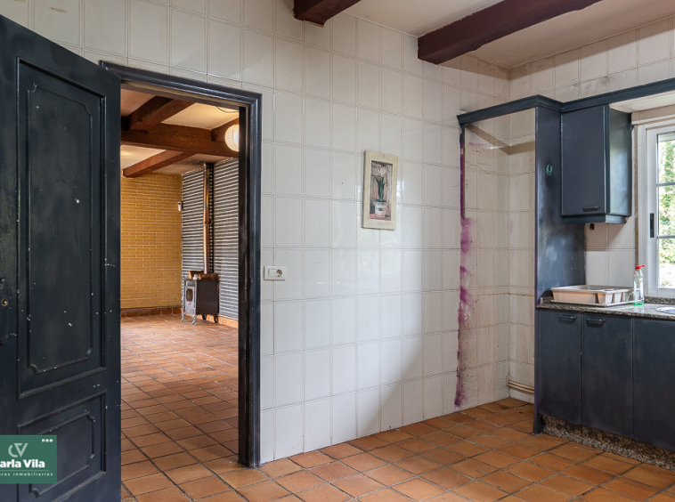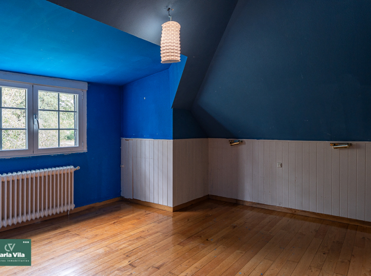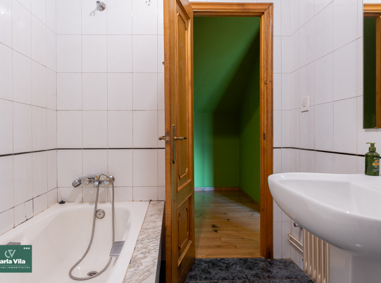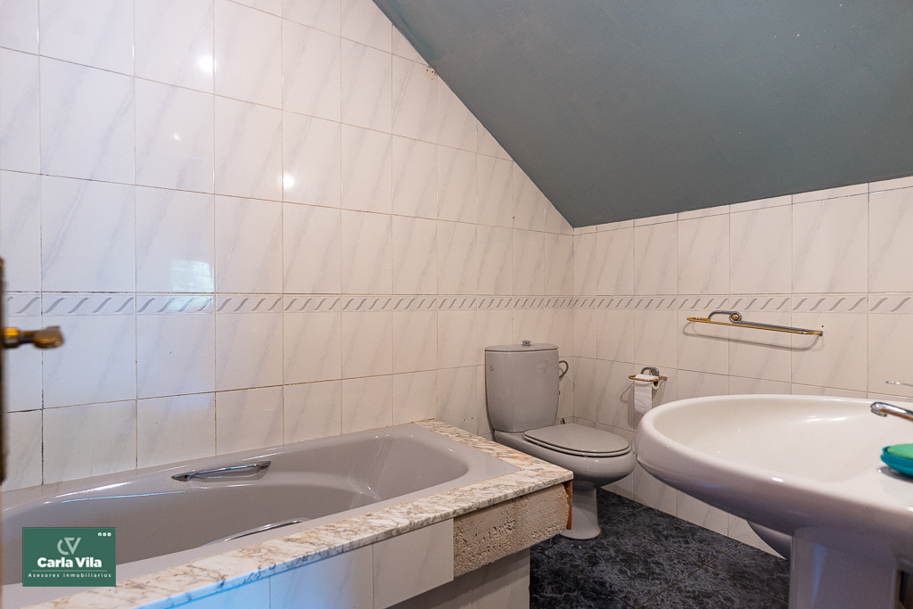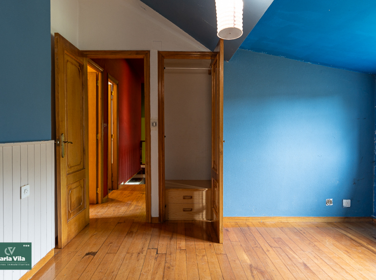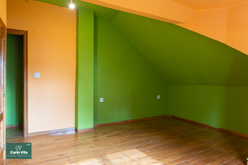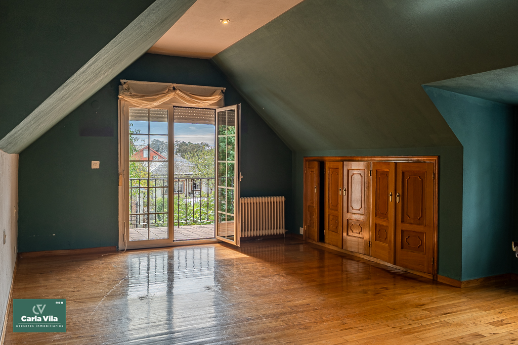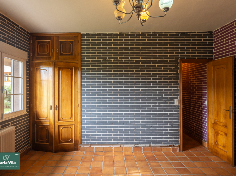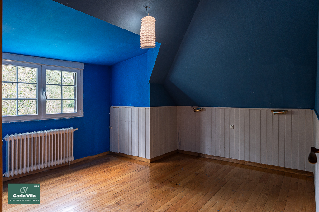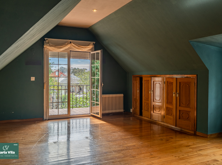 Arriba, el distribuidor reparte tres dormitorios entre los que destaca uno espectacular, con terraza orientada al sur que abre vistas a la finca —a ese verde que se mueve con la brisa y al cielo que se asoma—, con baño en suite y armarios empotrados que guardan historias. Aquí las mañanas empiezan con luz, calma y sensación de refugio. Un segundo baño común acompaña a las otras dos habitaciones.