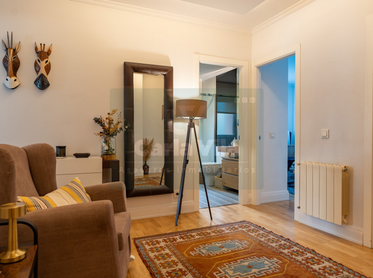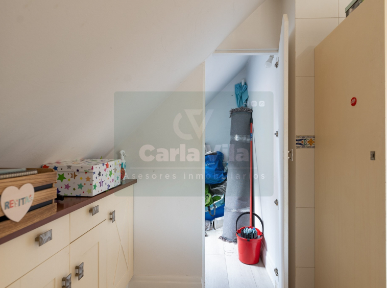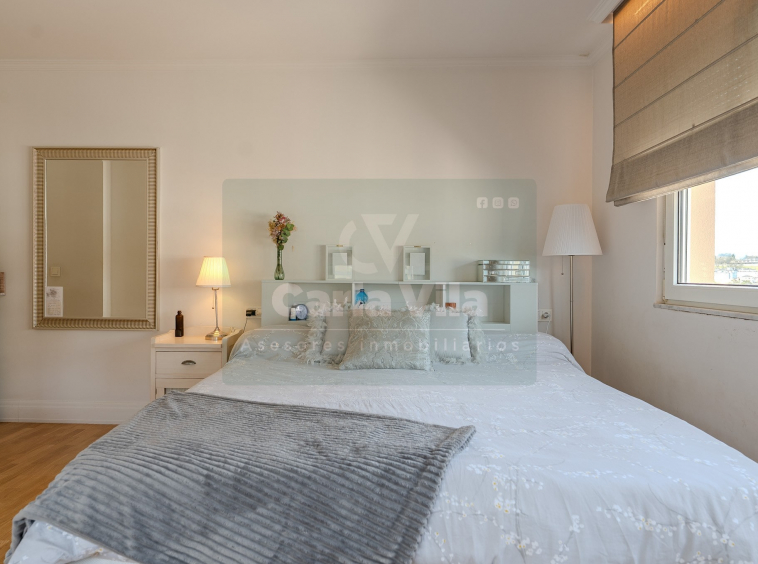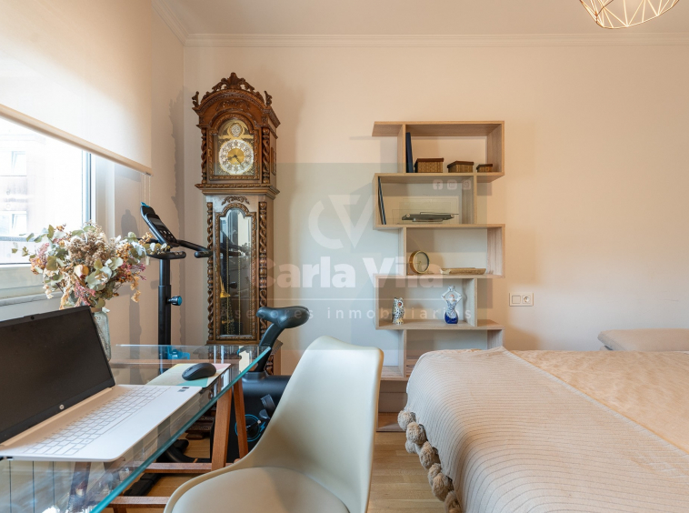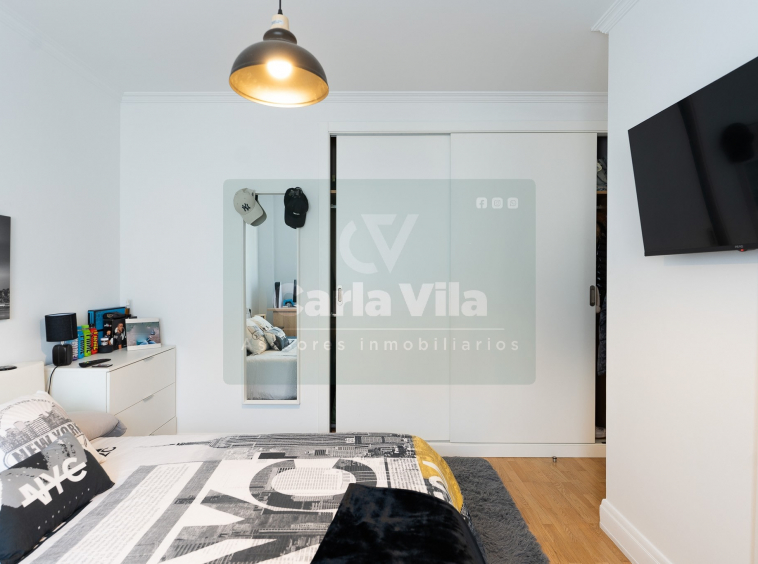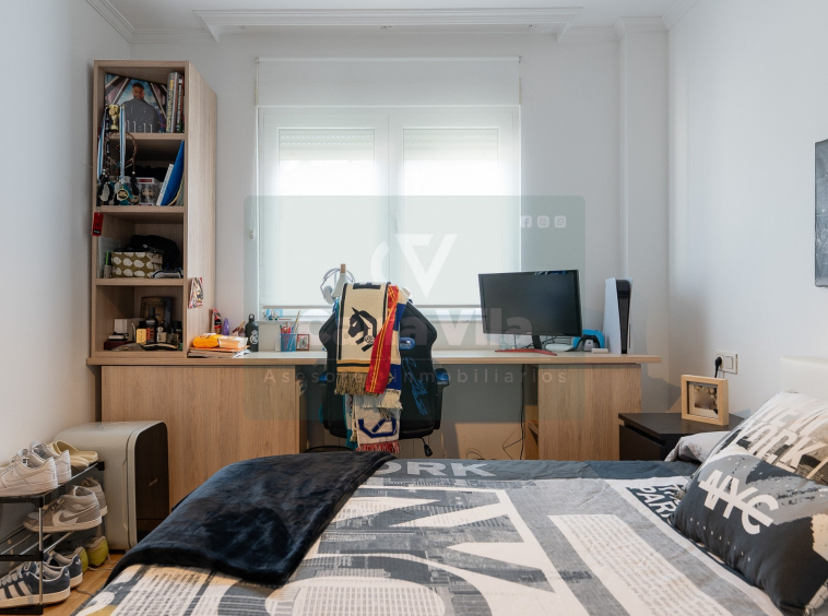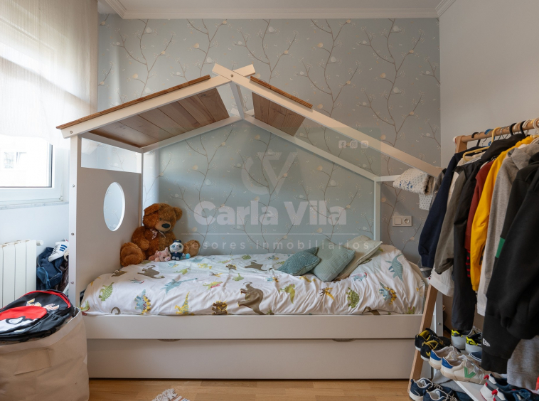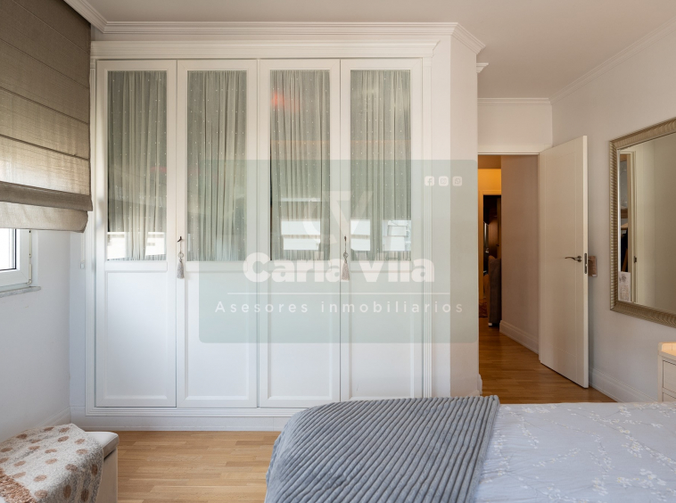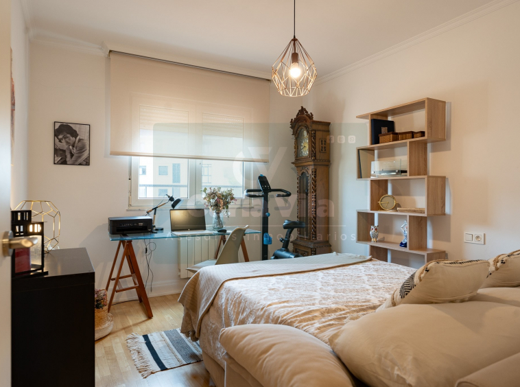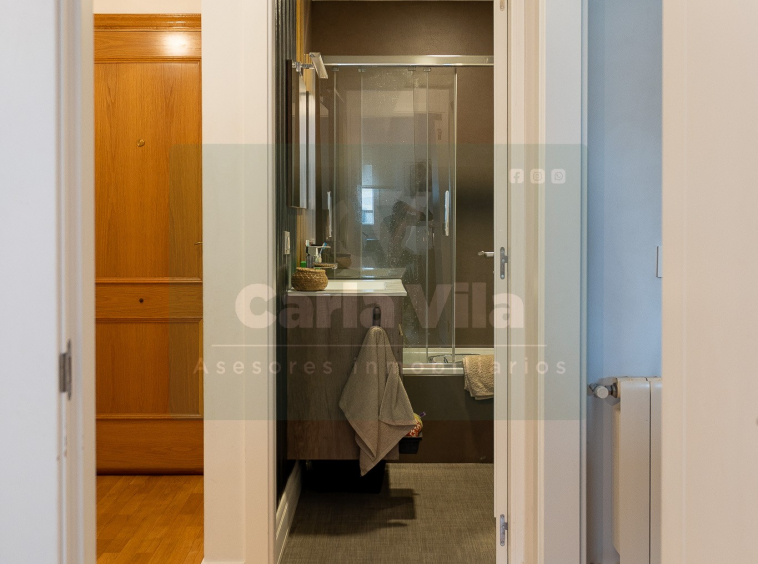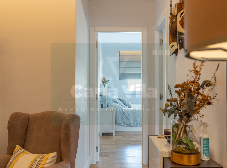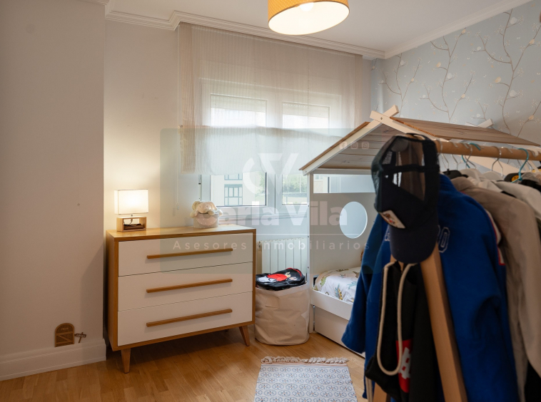 Abajo, el descanso. Tres dormitorios, todos exteriores, con armarios empotrados, y un hall con alma camaleónica que puede ser recibidor, rincón de trabajo o incluso vestidor, según lo que pida cada etapa de vida. La habitación principal hace esquina y desde su ventana el río vuelve a aparecer, discreto y sereno. El baño también ha sido renovado con gusto, con ducha, ventana y un suelo vinílico que imita tejido, detalle que suma sin buscar protagonismo. La zona de colada, bajo la escalera, aporta almacenaje extra y funcionalidad sin robar espacio.