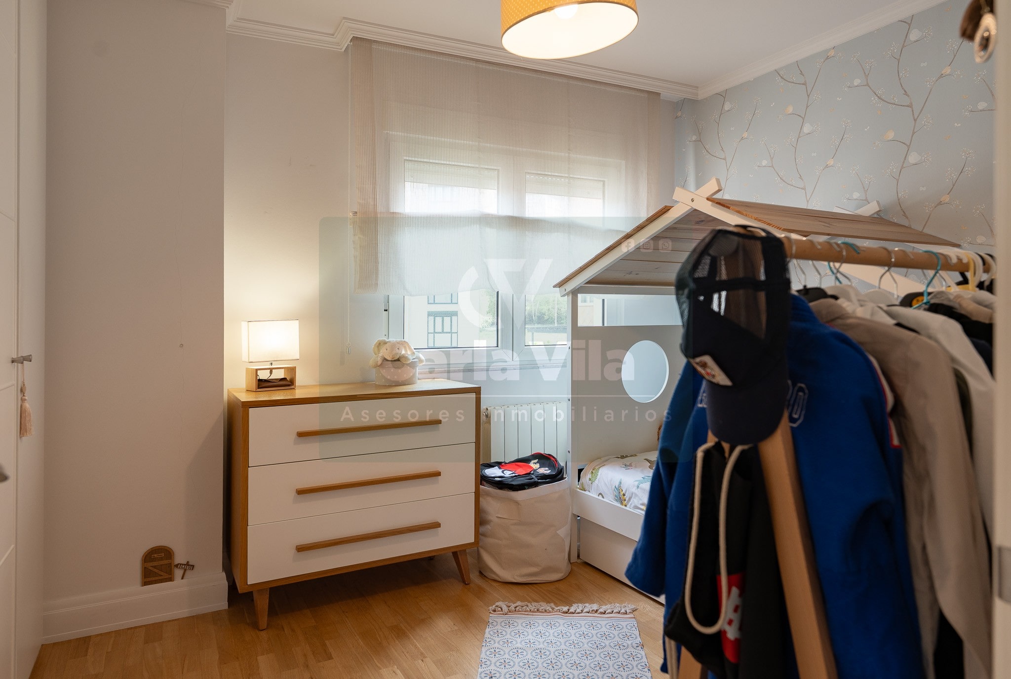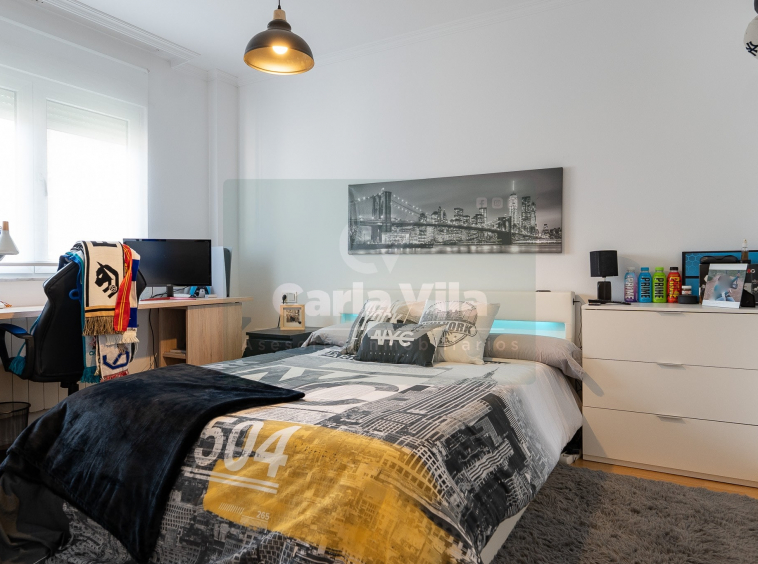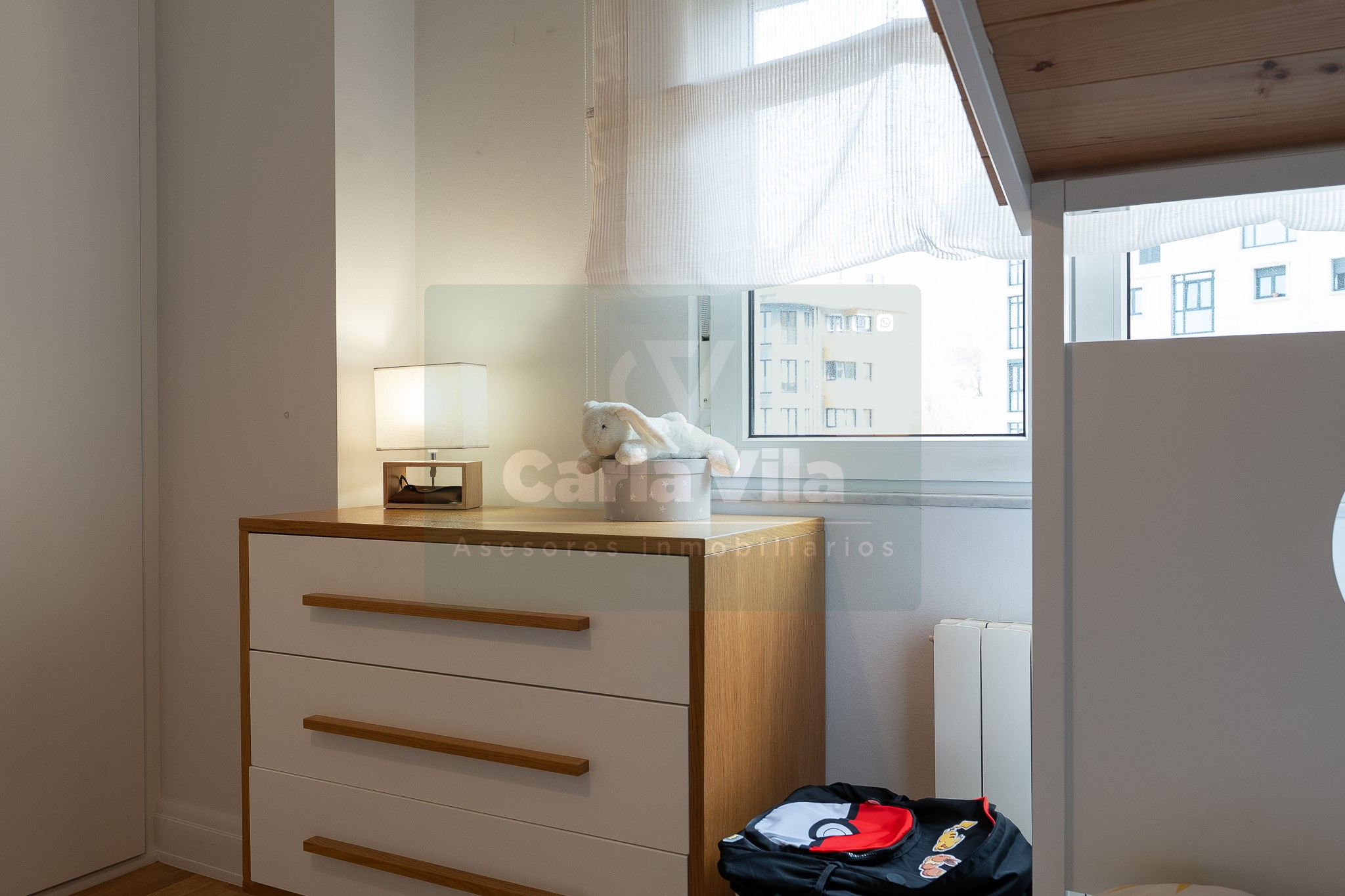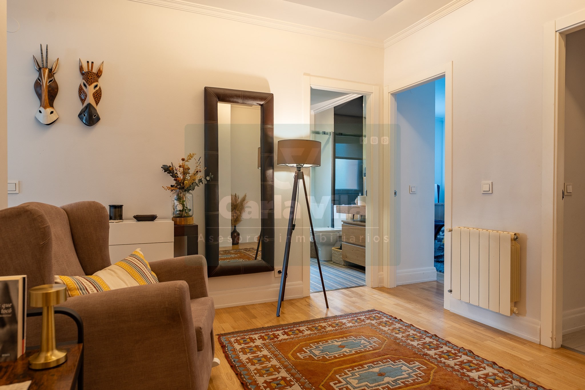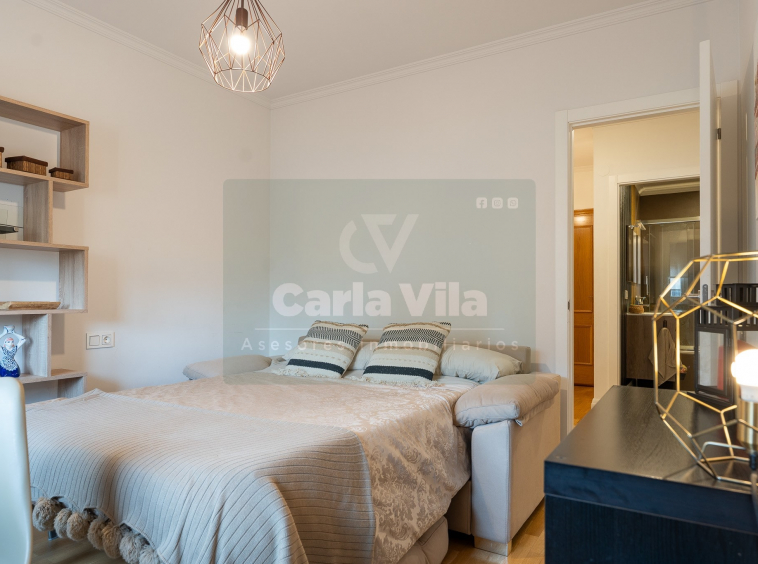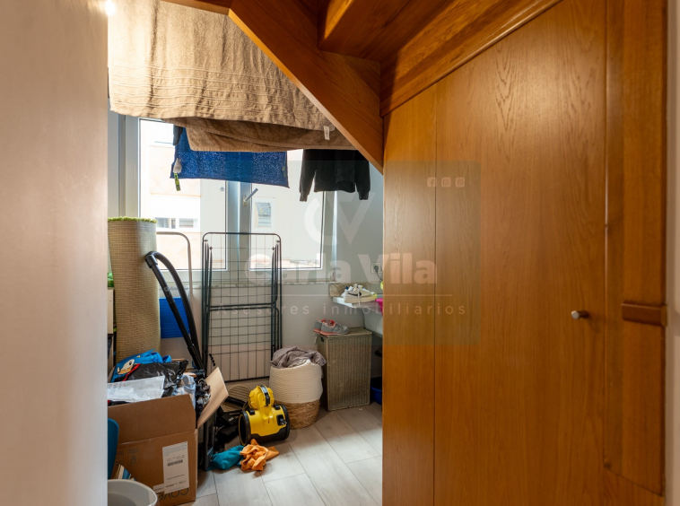 Abajo, el descanso. Tres dormitorios, todos exteriores, con armarios empotrados, y un hall con alma camaleónica que puede ser recibidor, rincón de trabajo o incluso vestidor, según lo que pida cada etapa de vida. La habitación principal hace esquina y desde su ventana el río vuelve a aparecer, discreto y sereno. El baño también ha sido renovado con gusto, con ducha, ventana y un suelo vinílico que imita tejido, detalle que suma sin buscar protagonismo. La zona de colada, bajo la escalera, aporta almacenaje extra y funcionalidad sin robar espacio.