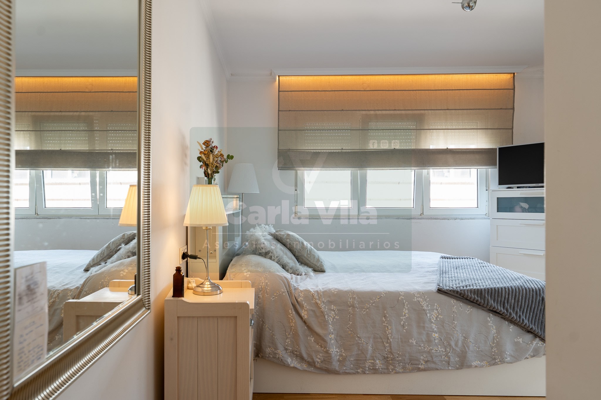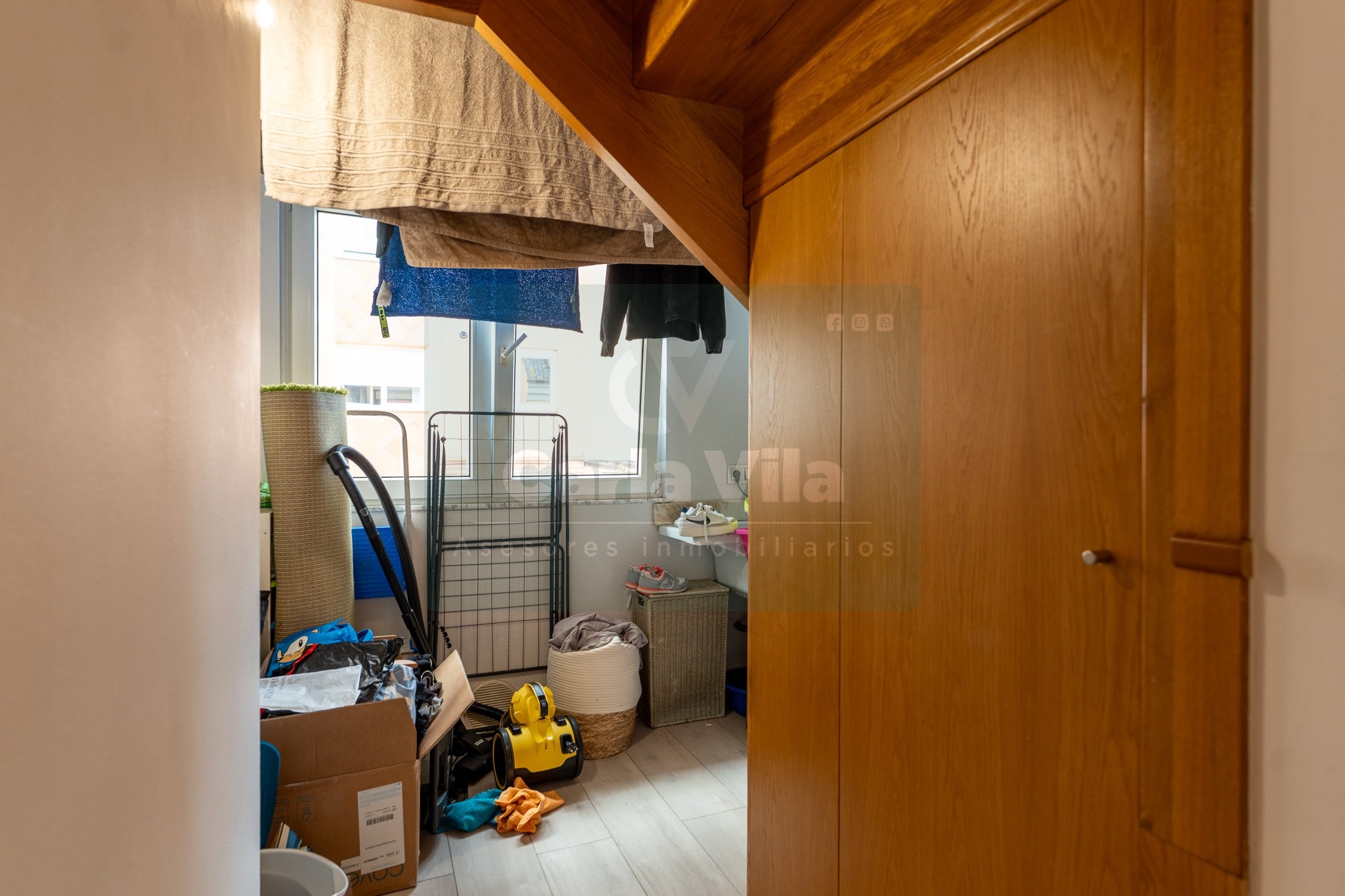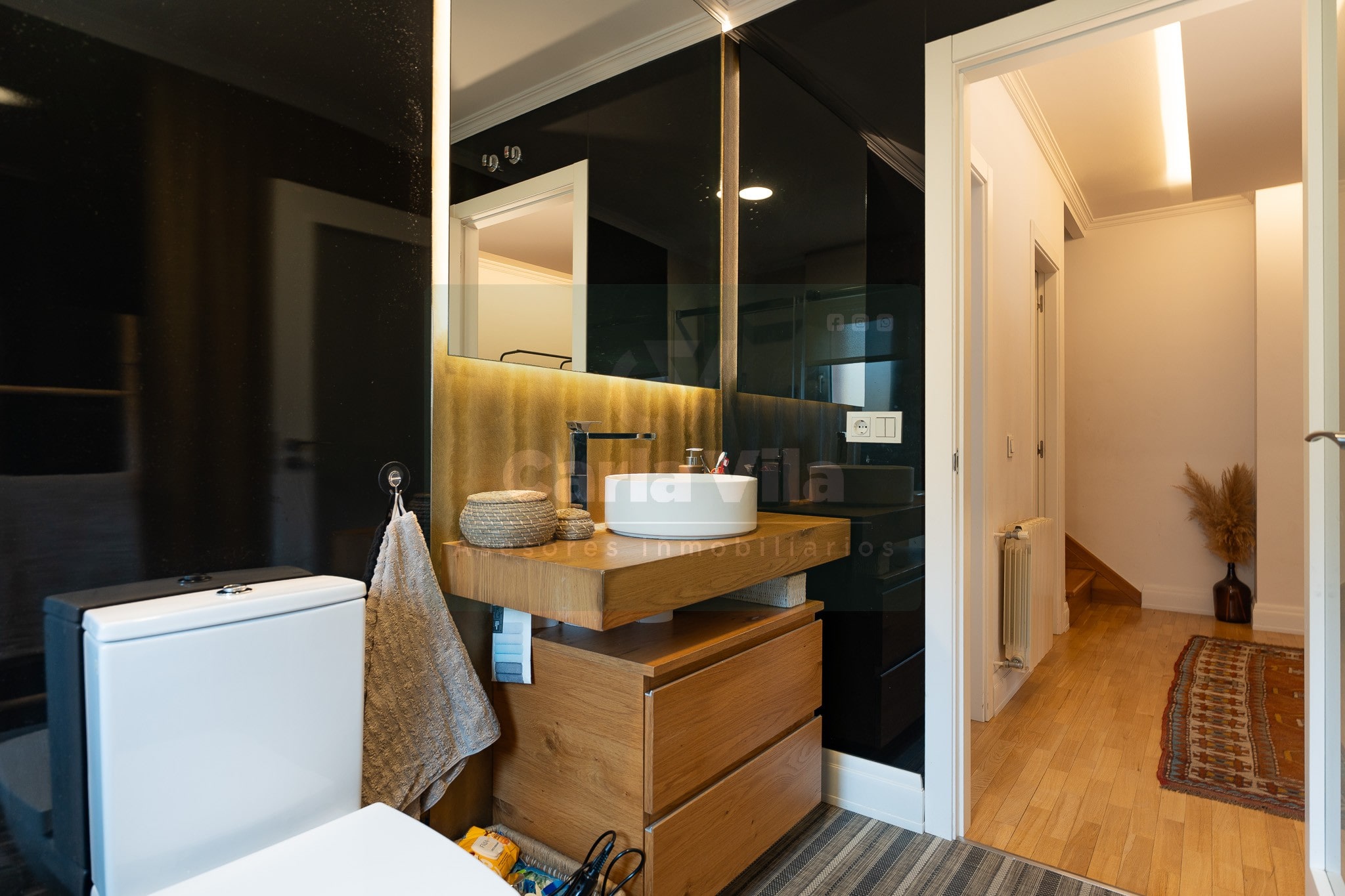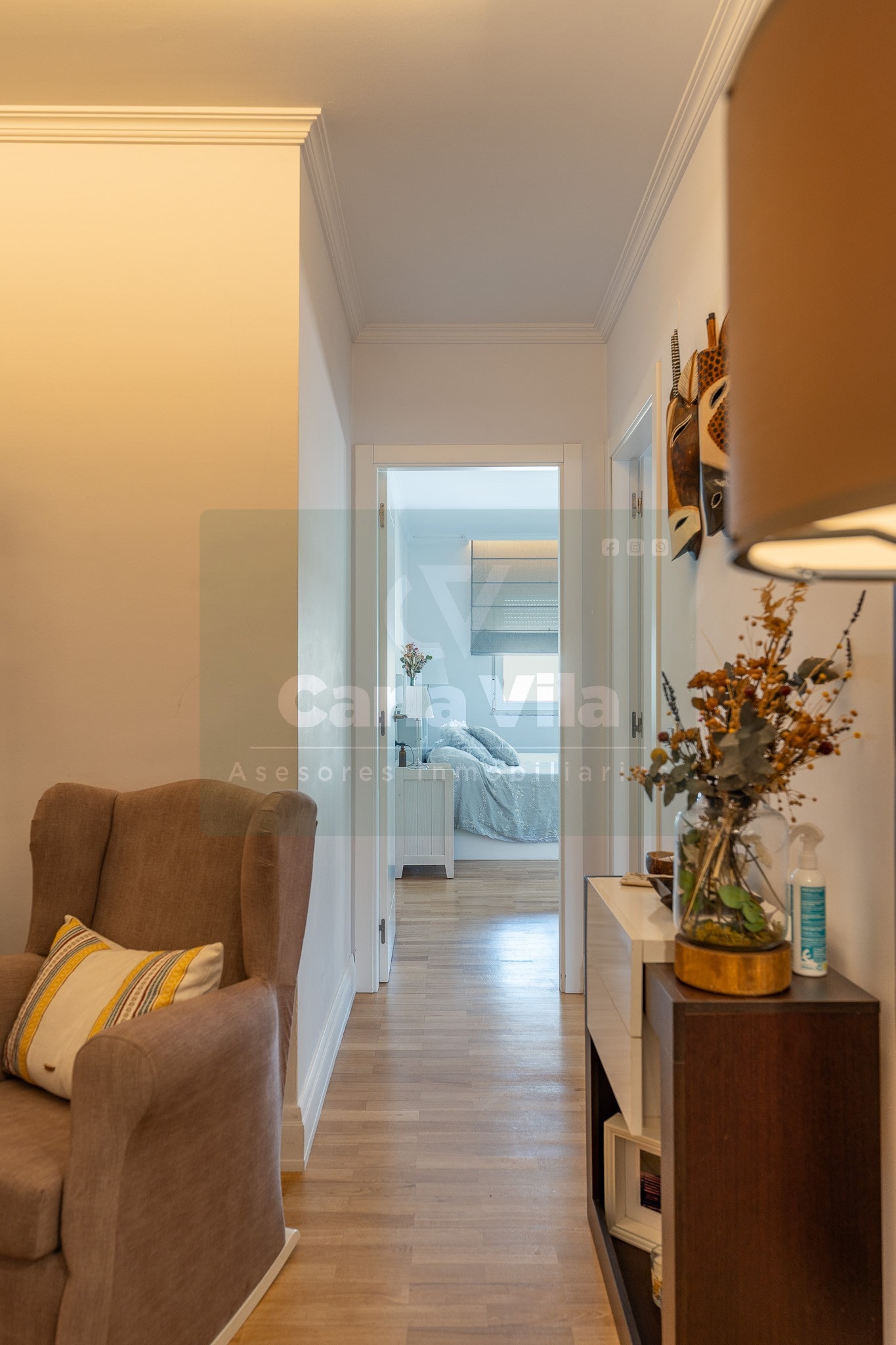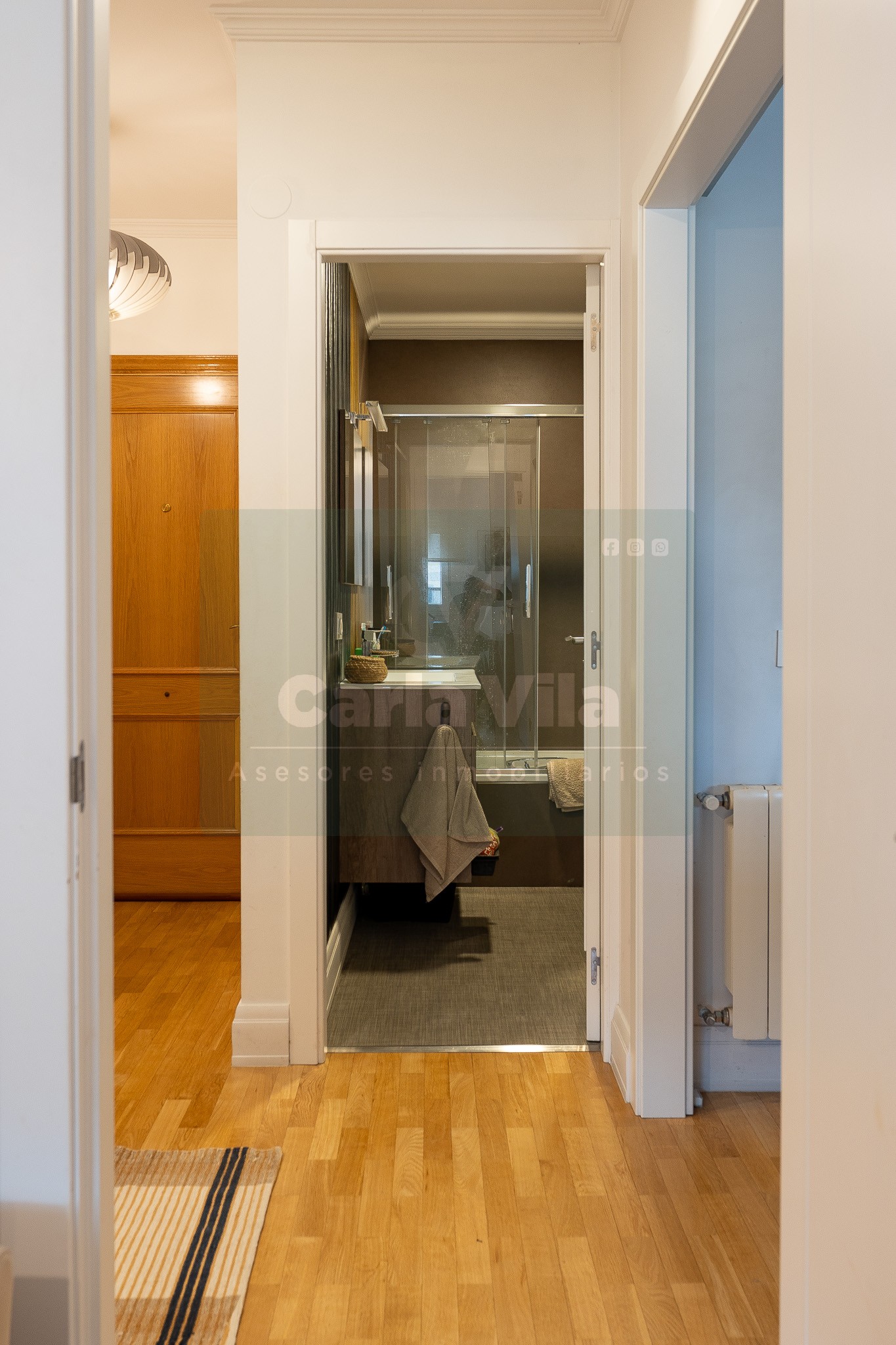 Abajo, el descanso. Tres dormitorios, todos exteriores, con armarios empotrados, y un hall con alma camaleónica que puede ser recibidor, rincón de trabajo o incluso vestidor, según lo que pida cada etapa de vida. La habitación principal hace esquina y desde su ventana el río vuelve a aparecer, discreto y sereno. El baño también ha sido renovado con gusto, con ducha, ventana y un suelo vinílico que imita tejido, detalle que suma sin buscar protagonismo. La zona de colada, bajo la escalera, aporta almacenaje extra y funcionalidad sin robar espacio.