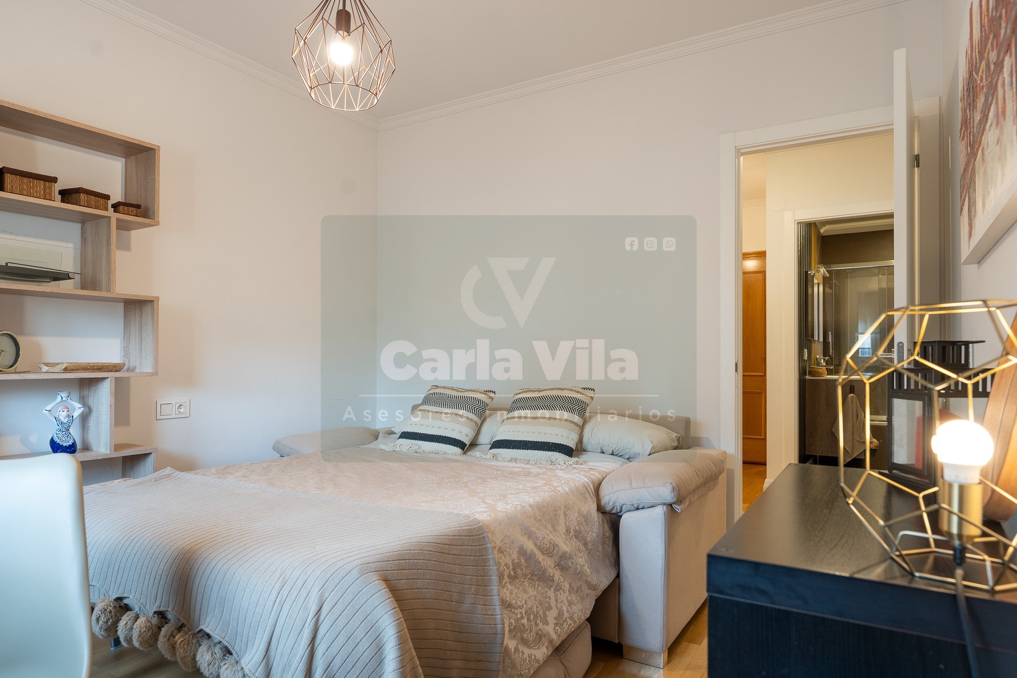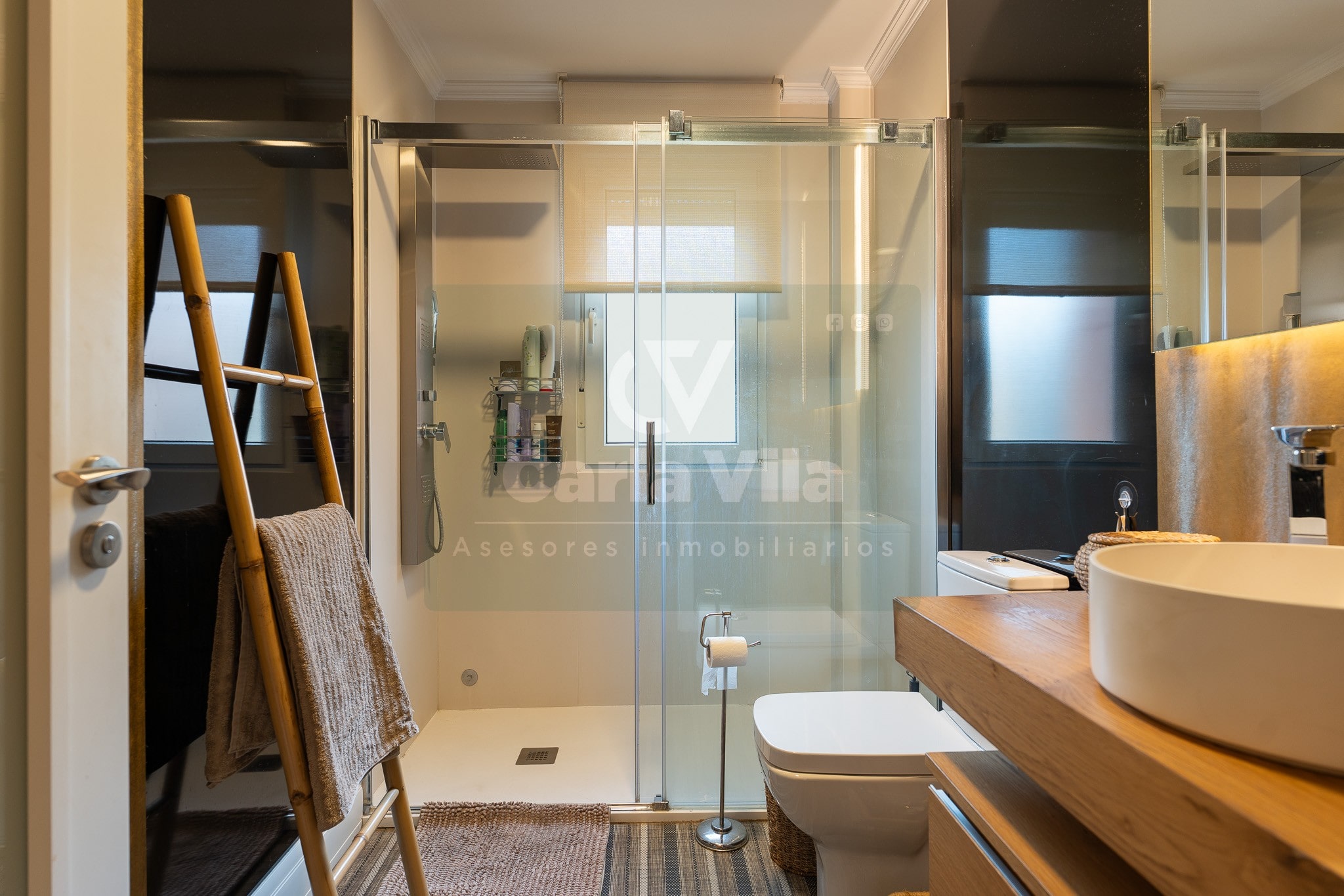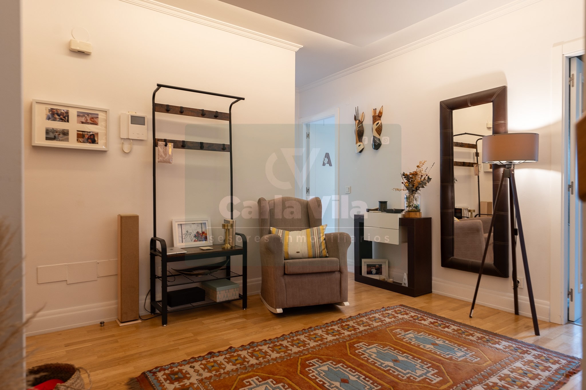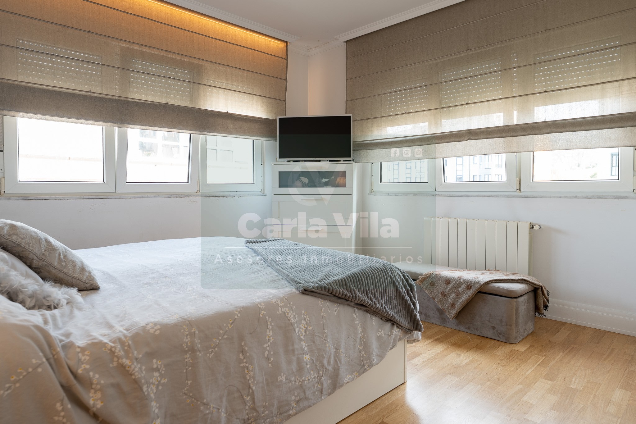 Abajo, el descanso. Tres dormitorios, todos exteriores, con armarios empotrados, y un hall con alma camaleónica que puede ser recibidor, rincón de trabajo o incluso vestidor, según lo que pida cada etapa de vida. La habitación principal hace esquina y desde su ventana el río vuelve a aparecer, discreto y sereno. El baño también ha sido renovado con gusto, con ducha, ventana y un suelo vinílico que imita tejido, detalle que suma sin buscar protagonismo. La zona de colada, bajo la escalera, aporta almacenaje extra y funcionalidad sin robar espacio.