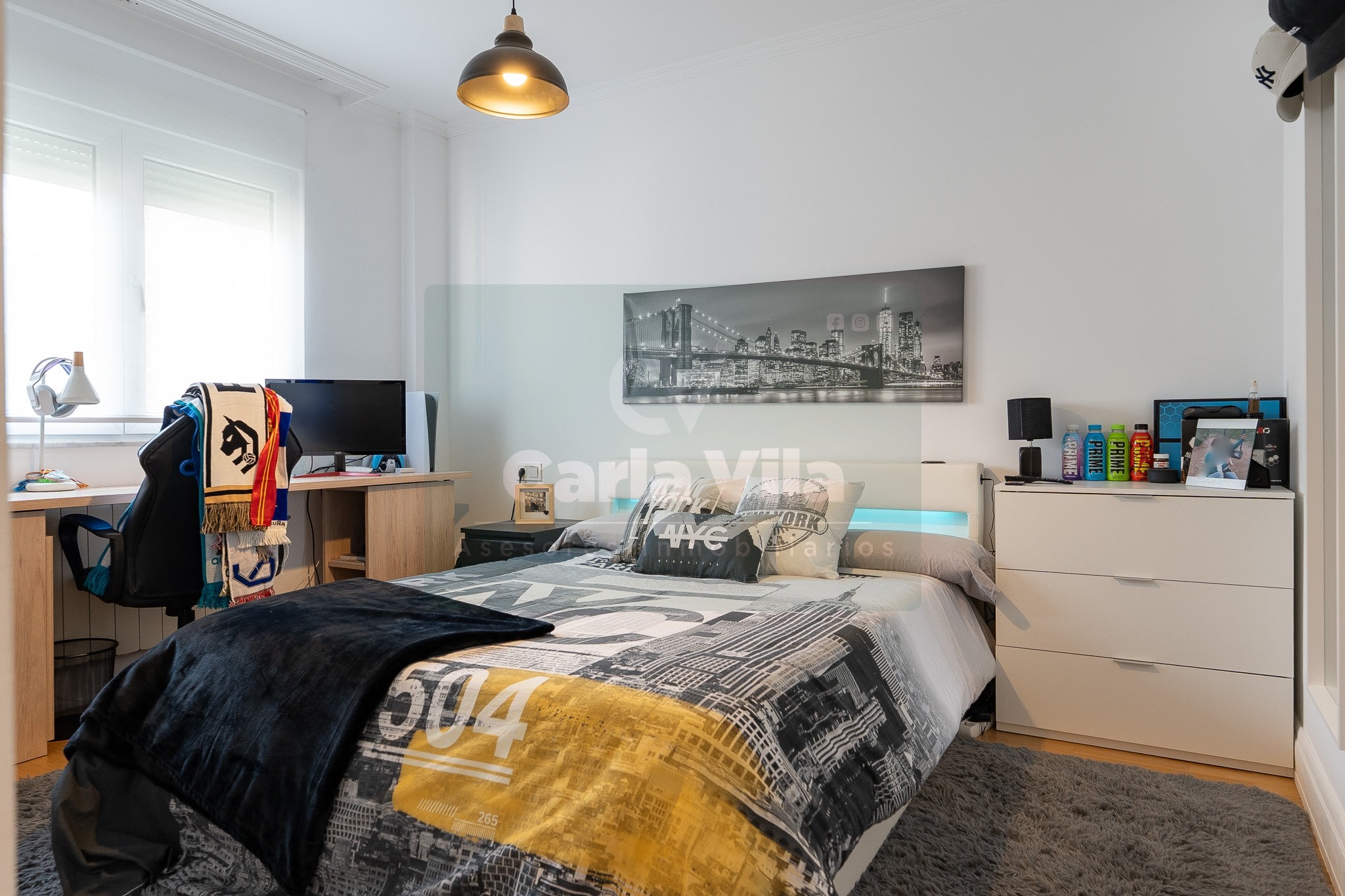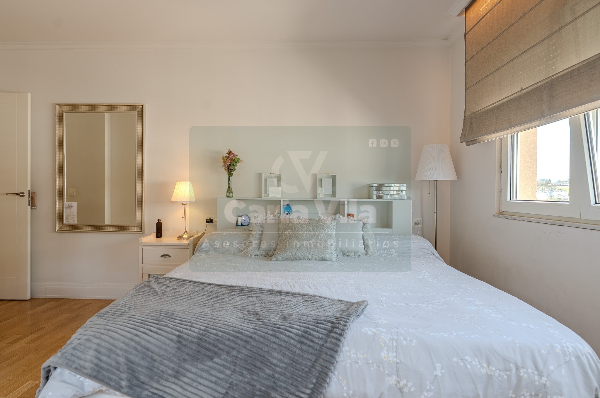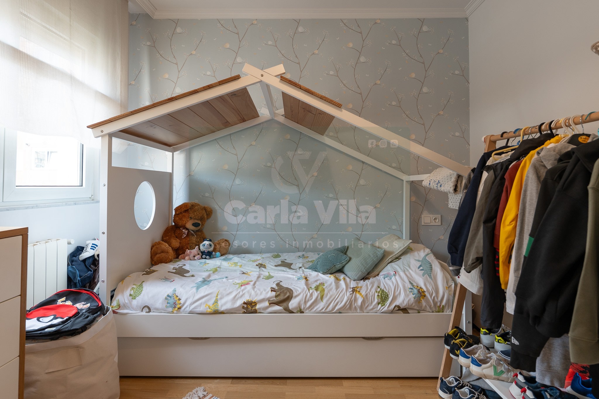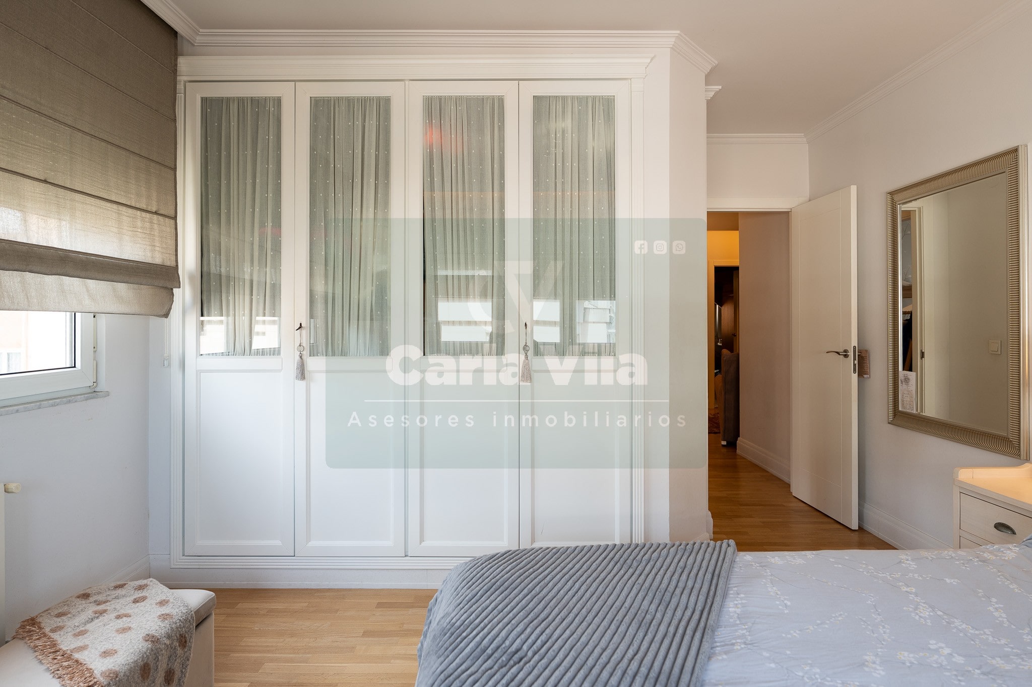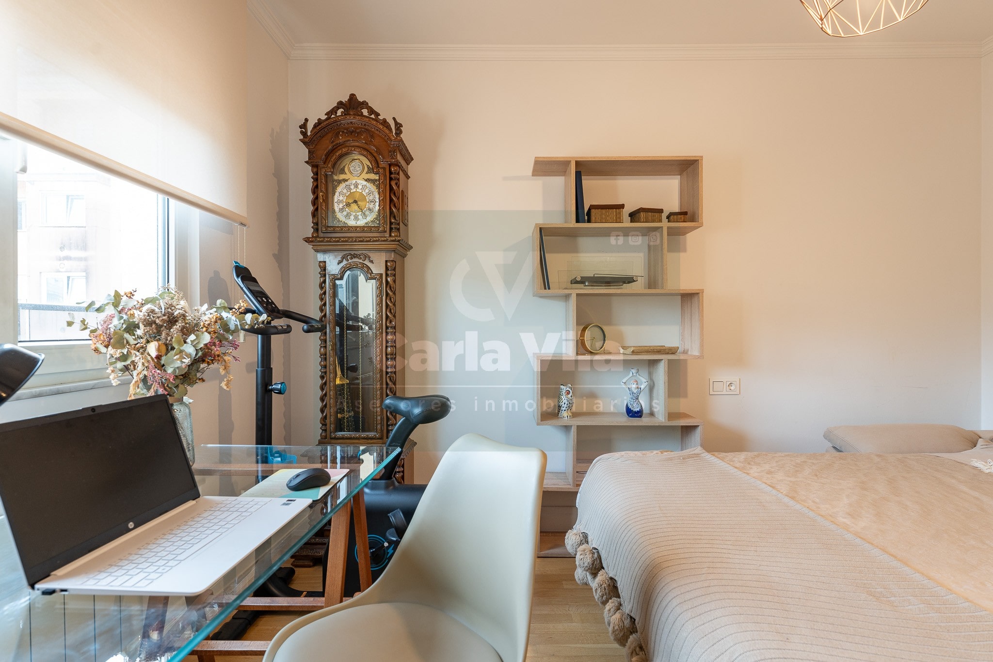 Abajo, el descanso. Tres dormitorios, todos exteriores, con armarios empotrados, y un hall con alma camaleónica que puede ser recibidor, rincón de trabajo o incluso vestidor, según lo que pida cada etapa de vida. La habitación principal hace esquina y desde su ventana el río vuelve a aparecer, discreto y sereno. El baño también ha sido renovado con gusto, con ducha, ventana y un suelo vinílico que imita tejido, detalle que suma sin buscar protagonismo. La zona de colada, bajo la escalera, aporta almacenaje extra y funcionalidad sin robar espacio.